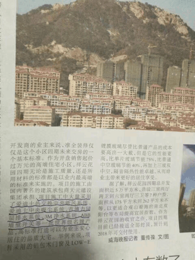 據了解,祥云花園總建筑面積18萬平方米,由13幢小高層和6幢多層組成,一、二、三期已全部售完,四期總開發面積5萬平方米,共設三室兩廳兩衛到六室兩廳三衛等7種戶型,面積從175平方米到262平方米不等,以更適合觀山看海的南北雙陽臺等布局提高宜居指數。準全裝修僅僅這個項目交房的一個基本標準。作為威海開盤銷售起價過完元的高端住宅小區,祥云花園無論是施工質量,還是所用材料的標準都是以業內最高端的標準來實施的。項目施工中大量采用了愛迪士熱交換中央新風系統以及愛迪士中央吸塵系統,并榮登《威海晚報》。
