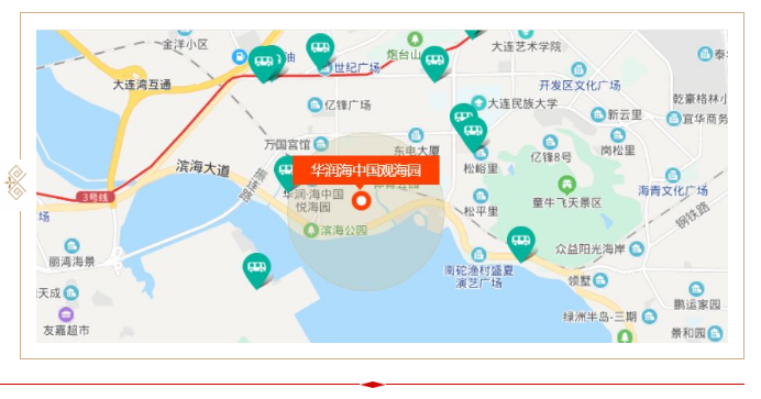 華潤海中國位于大連經濟技術開發區南部濱海新區3號地,南面緊鄰濱海大道及海濱帶狀旅游綠地,直面大連灣遼闊海域;西與開發區至大連市中心的主干路振興路和規劃中的振連路相連;北面為高爾夫球場、網球場及人工湖;東面有海上休閑廣場及東山風景區,華潤海中國獨有一線無遮擋海景。